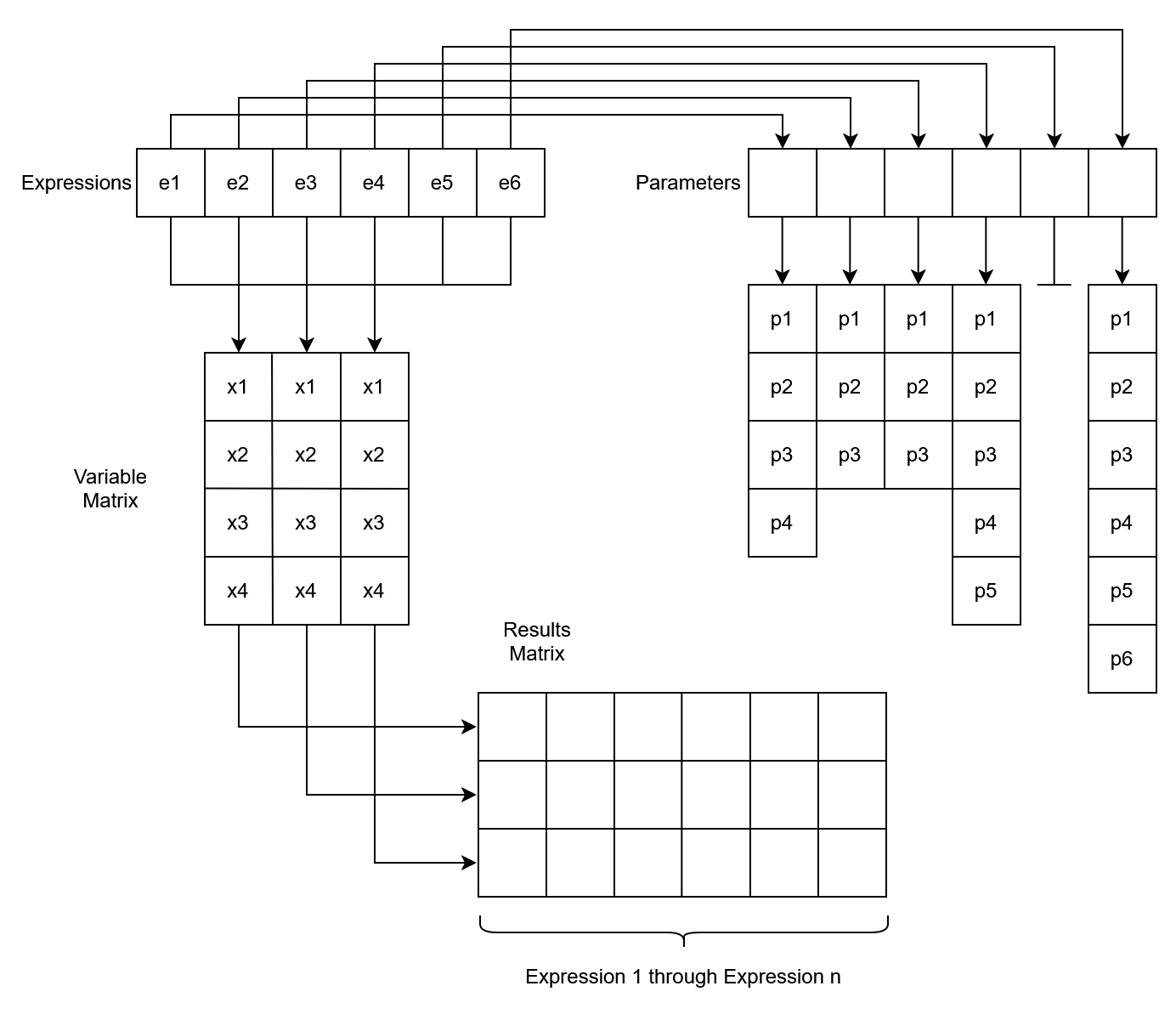 The figure below demonstrates how the input data is structured and how they work together. Note that all x1..xn and p1..pn are the markers for the variables and parameters used in the expressions and can have an arbitrary value. Not every p1 needs to have the same value and not every x1 needs to have the ame value. Explanation of the input data